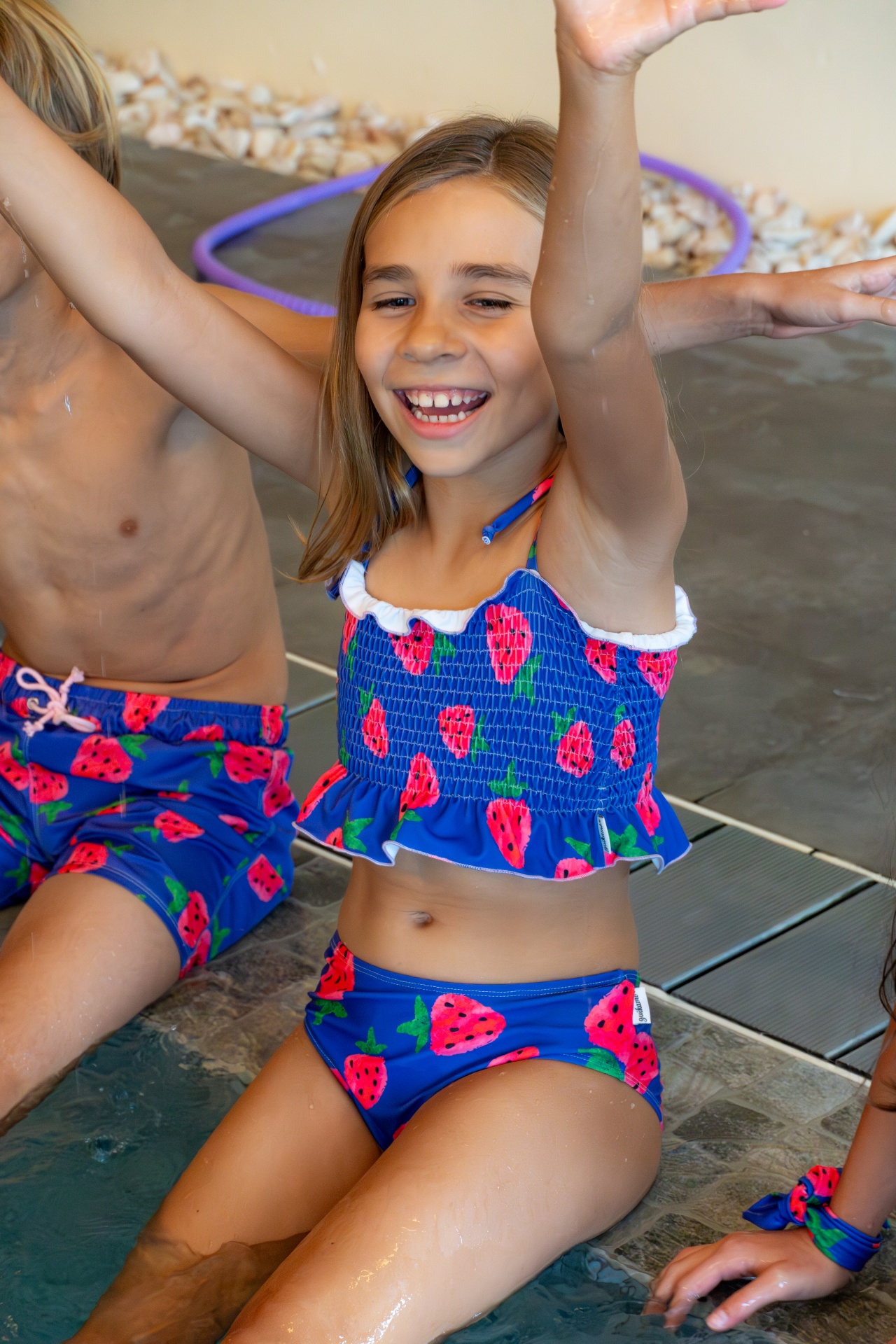 • Crianças com fatos de banho azuis com padrão de morangos, segurando um aro roxo junto a uma piscina interior.