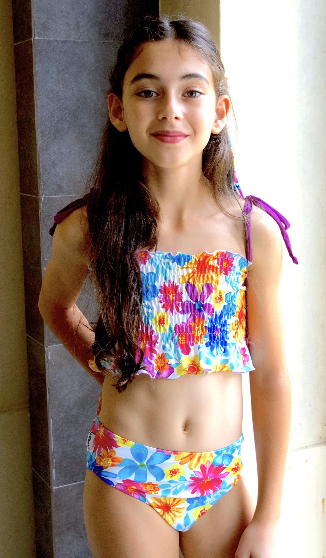 • Menina jovem com biquíni floral colorido em ambiente interior