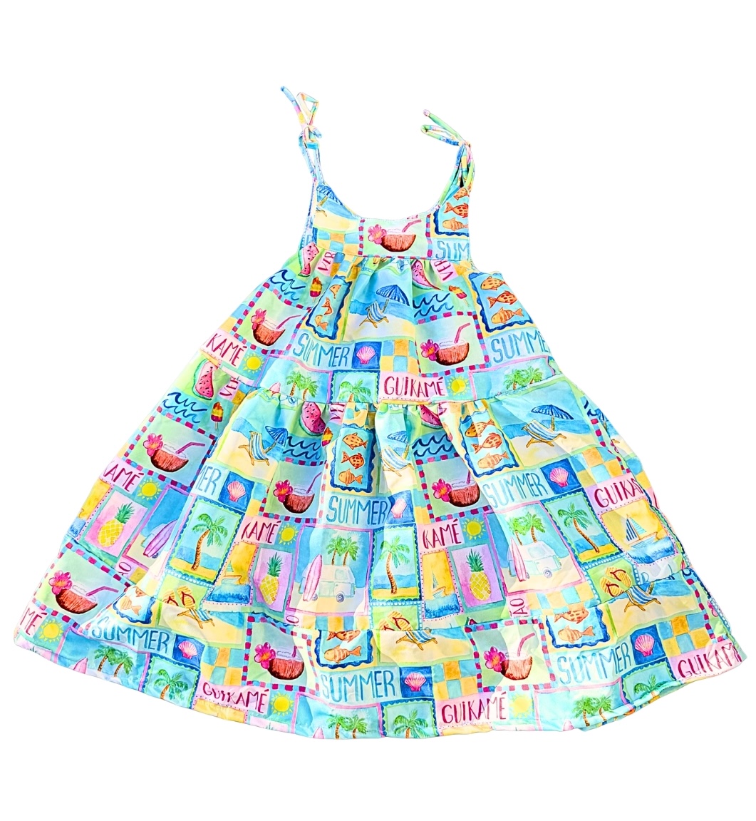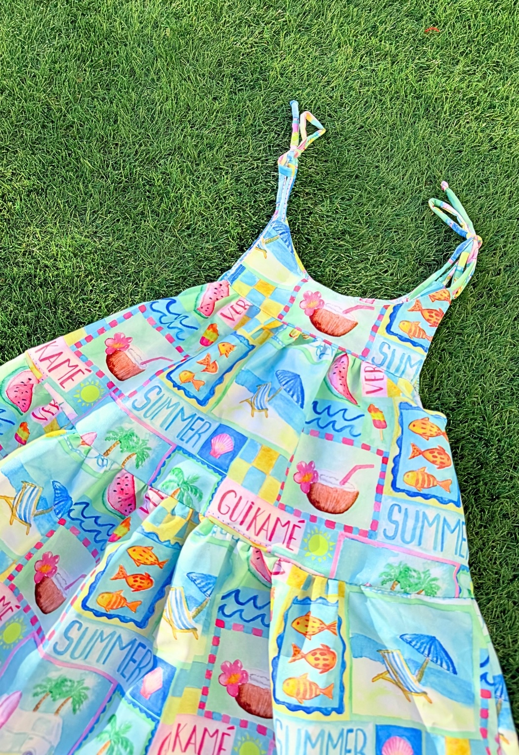 • Vestido infantil colorido com estampa de verão e palavras em azul, amarelo e rosa